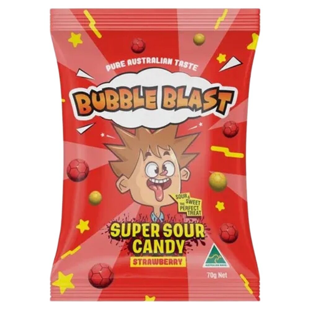 Experience an intense burst of tangy sweetness with Bubble Blast Super Sour Strawberry Candy 70g. Each piece is coated in a bold sour layer that quickly reveals a sweet and juicy strawberry centre for an unforgettable taste sensation. This candy offers a deliciously tangy twist on a berry classic, perfect for thrill seekers who love a powerful sour hit followed by fruity sweetness.