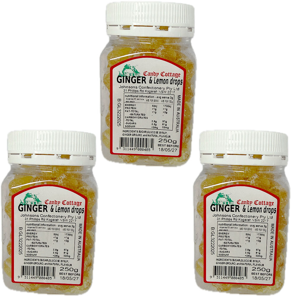 3 x Candy Cottage Ginger & Lemon Drops 250g Jars