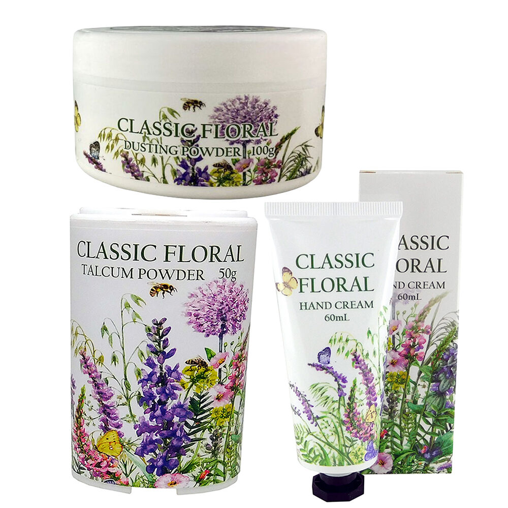 Enjoy timeless elegance and everyday comfort with the Classic Floral Luxury Talcum Powder Hand Cream and Dusting Powder Gift Set, a beautifully coordinated three piece collection designed to leave skin soft smooth and delicately scented. Ideal for daily self care or gifting, this set combines moisture absorbing powders with nourishing hand care infused with a fresh inspiring classic floral fragrance. The luxury talcum powder delivers a silky smooth feel while helping keep skin dry and comfortable, allowing the exotic floral scent to gently envelop the skin. The classic floral hand cream absorbs quickly to nourish and soften hands without leaving a greasy residue, leaving skin smooth refreshed and lightly fragranced. Complete your routine with the classic floral dusting powder, formulated to absorb moisture reduce friction and keep skin feeling fresh comfortable and softly scented throughout the day. Contents: