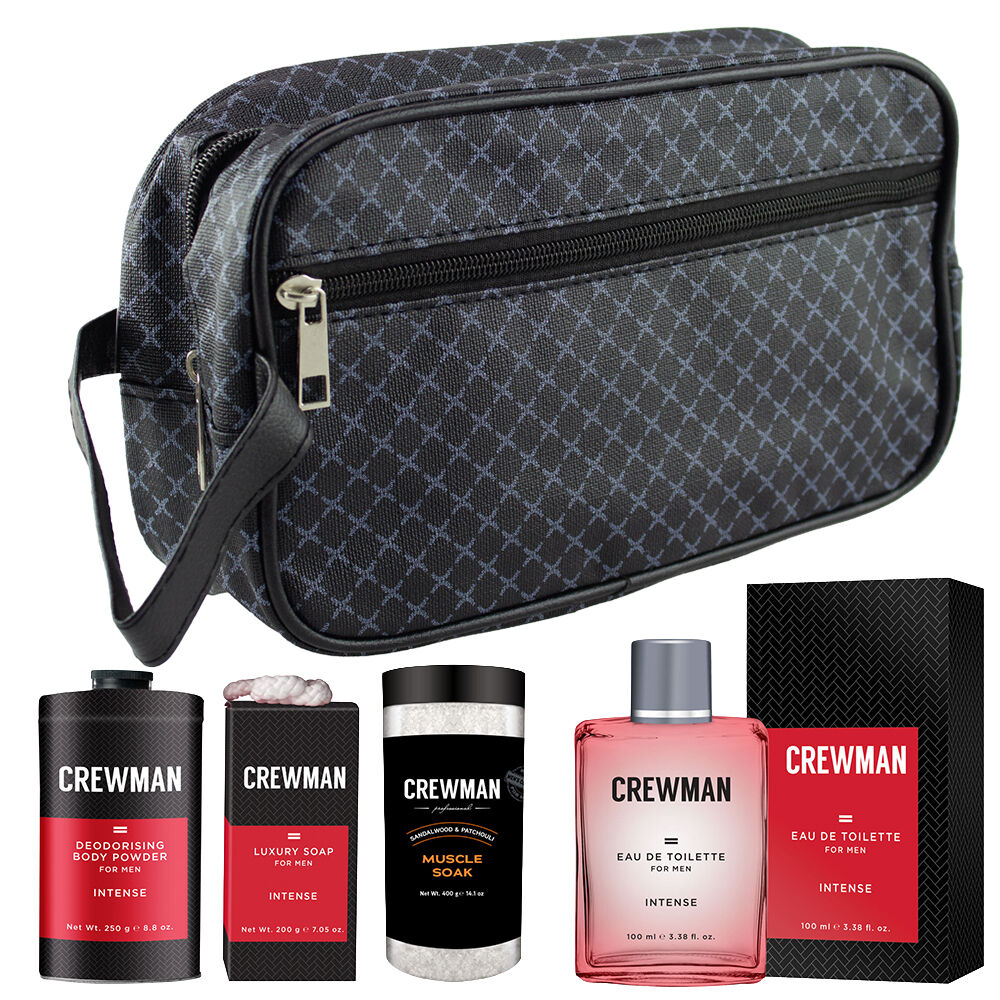 Make a bold statement every day with the Crewman Intense Mens Grooming Set combined with Crewman Muscle Soak Bath Salts, delivering powerful fragrance complete body care and post workout relaxation in one premium value bundle. Designed for men who want to project confidence strength and style, this set offers better value than purchasing items individually and is ideal for everyday grooming travel or gifting. The Crewman Intense grooming collection includes an eau de toilette luxury body soap talc free body powder textured netting sponge and a reusable black toiletry bag, all infused with the Intense fragrance that blends warm spices with deep woody notes for a strong masculine finish. Complementing the grooming essentials is the Crewman Muscle Soak Bath Salts formulated to help ease muscle tension and reduce fatigue after training work or long days. The mineral rich salts are infused with a rich sandalwood and patchouli fragrance that transforms bath time into a deeply relaxing restorative experience. Contents: