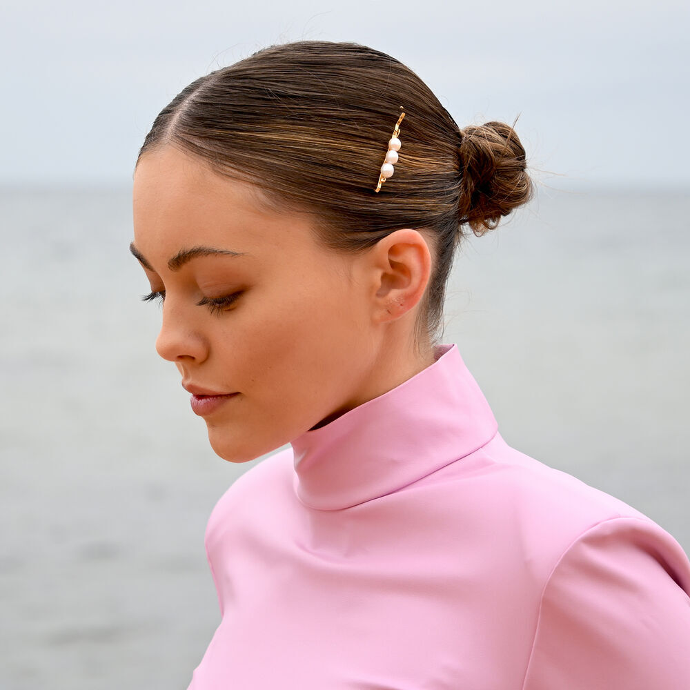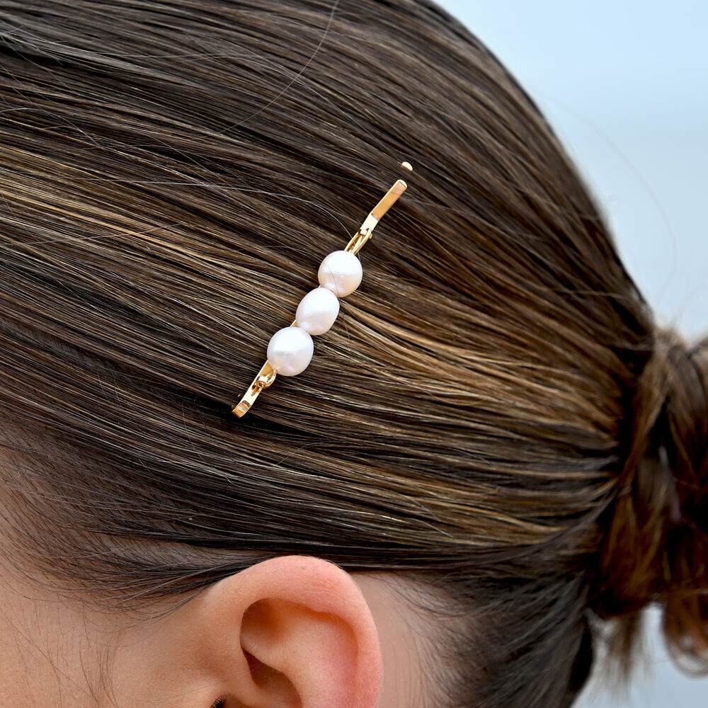Each pearl carries its own natural lustre and character, creating subtle variations that make every clip unique. The streamlined silhouette sits neatly in the hair, offering a secure hold without bulk — ideal for half-up styles, low buns, or a polished finishing detail.