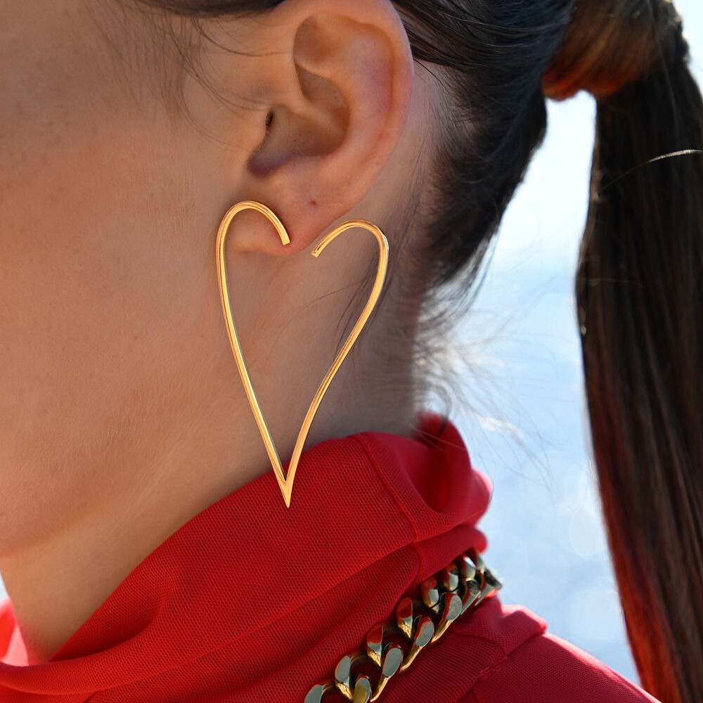 Modern, simple and eye-catching. Introducing Ayla Sculptural Love Heart Earrings - a chic and outspoken statement to rock a romantic statement. This design features stylised love hearts with a subtle flow. The earrings are made in environmentally friendly stainless steel with 2 microns of 18K gold plating (heavy gold plated) for a rich and noble gold shine. The elegance and simplicity compliment both simple and sophisticated outfits. Perfect for contemporary, artsy, creative styling, high fashion, dressy, feminine, smart casual, usual styles and more. Hypoallergenic, nickel, lead, and cadmium free.