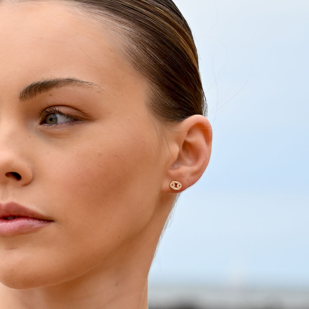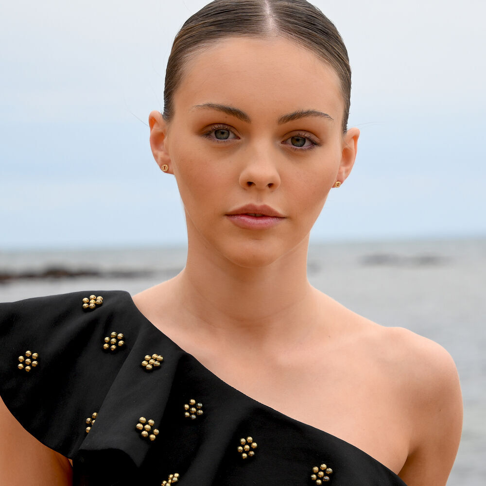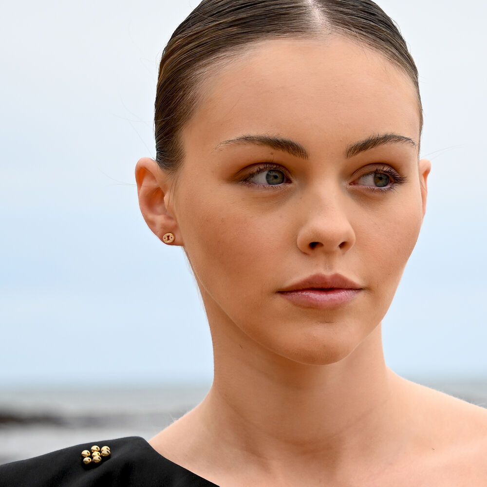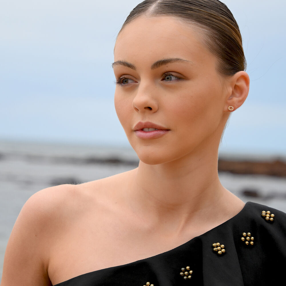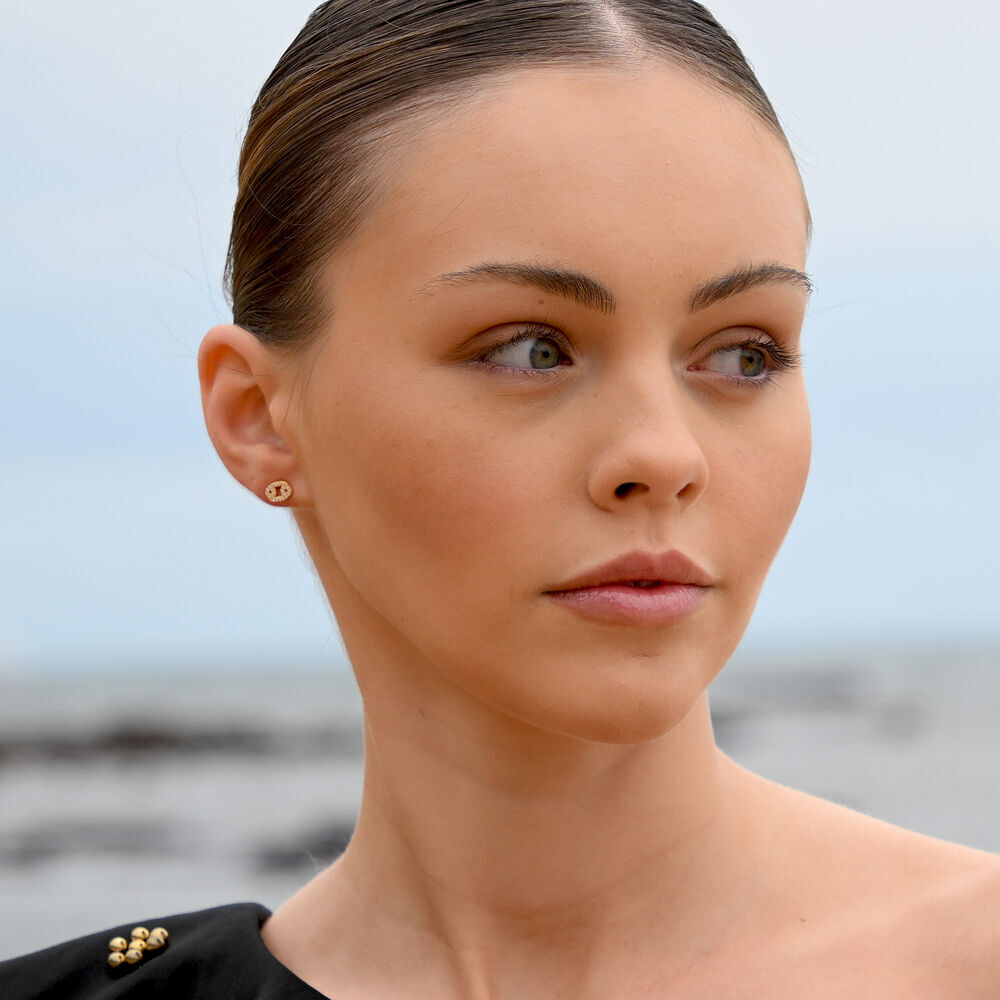 Each earring is meticulously crafted from solid sterling silver and finished with 2 microns of thick 18K gold plating, offering exceptional durability and a rich, luminous finish. The surface is set with Australian cubic zirconia pavé, creating a delicate constellation of light that catches and reflects with every movement.
