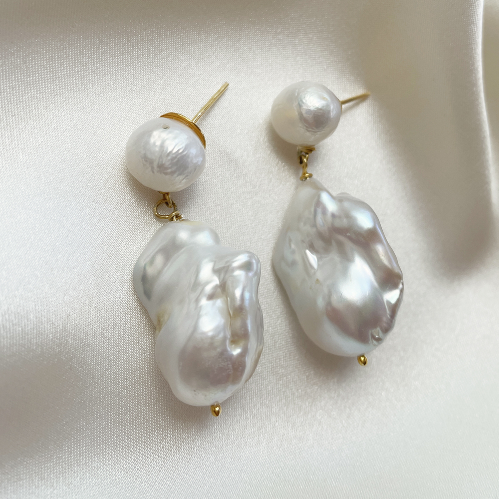 Pearl elegance comes in double. Introducing Cassandra 24K Baroque Pearl Drop Earrings — a New Age baroque pearl statement for the modern, the bold and the fine. This design features handpicked natural baroque pearls and freshwater pearls. The pearls present a smooth surface and high lustre. The dangling baroque pearls have a flared shape and the top freshwater pearls are round. The metal used is solid sterling silver with 24K gold plating to ensure hypoallergenic wear and durability. Perfect for formal, semi-formal, wedding, bridal, modern, retro, artsy, chic, feminine, coastal, bold, smart casual styles and more. Hypoallergenic, nickel, cadmium and lead free.