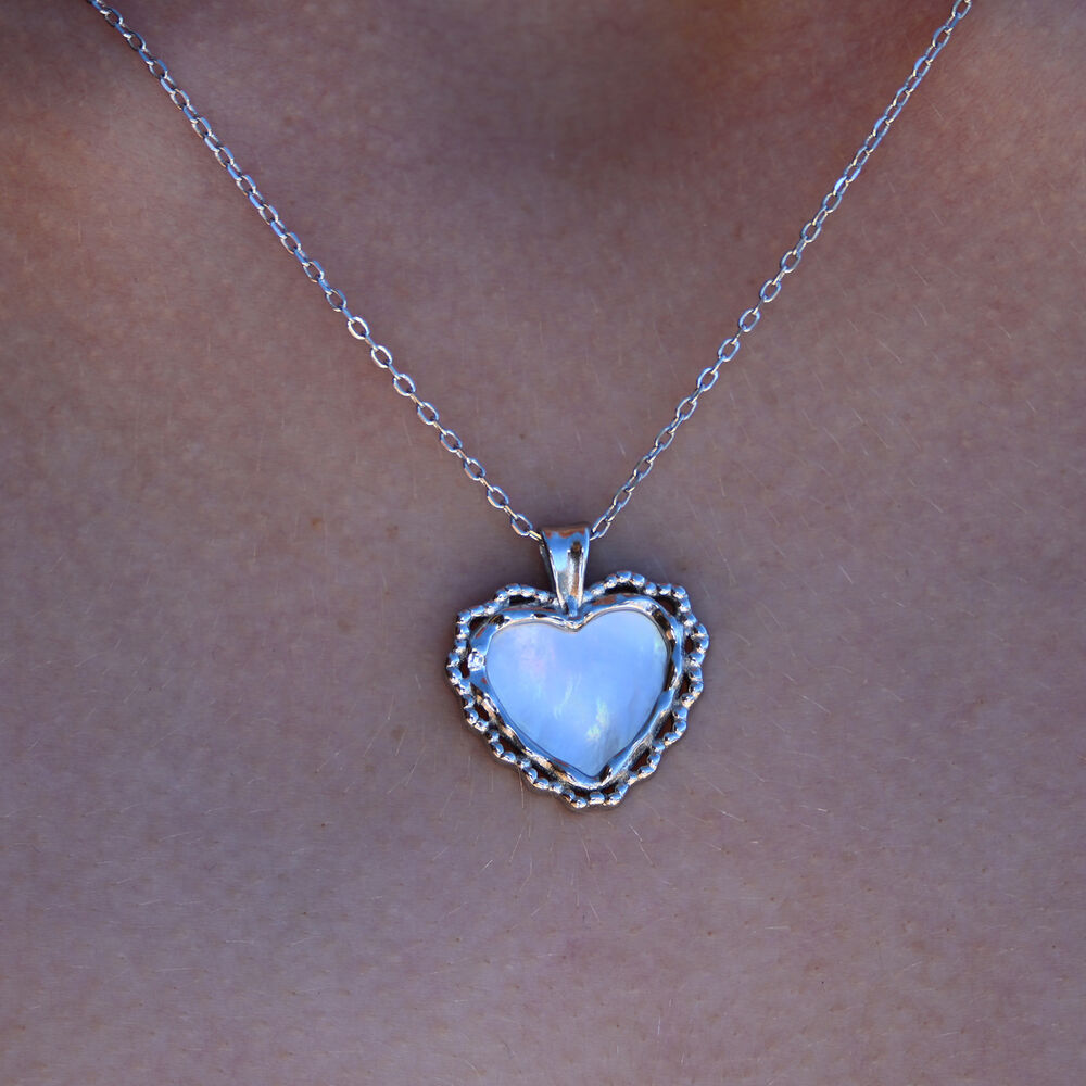 Elegant, romantic, and timeless. Introducing Charme Mother of Pearl Heart Pendant Necklace (Silver) - a classic and chic neckpiece with a French romantic charm. This design features custom cut and polished natural mother of pearl in a love heart shape embedded in a love heart shaped solid sterling silver frame. This neckpiece is made in solid sterling silver with rhodium plating for hypoallergenic, enduring wear and an extra anti-tarnish protection. A classy piece that is not subject to trends. Perfect for modern, retro, feminine, chic, girly, coastal, necklace layering, minimalist, smart casual, casual and everyday style. Hypoallergenic, nickel, lead, and cadmium free.