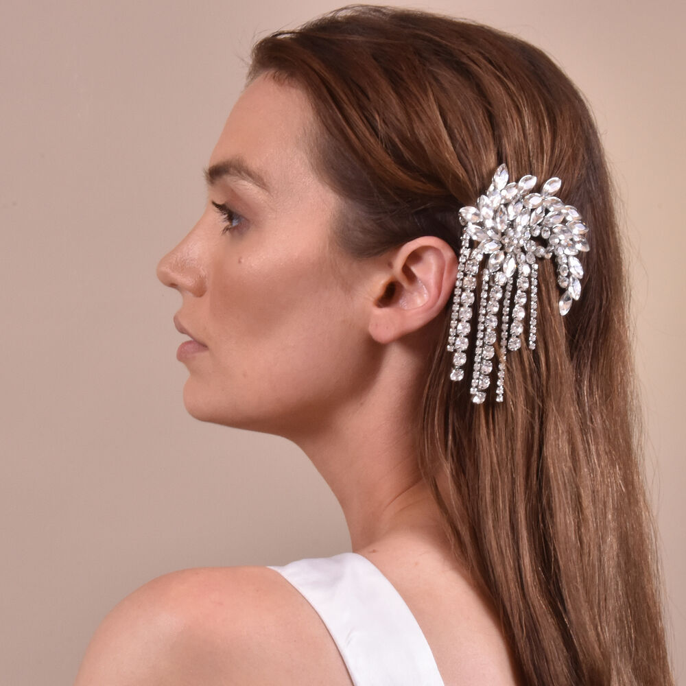 An eye-catching statement of uniqueness and extravagance. Introducing Irina Luxury Rhinestone Tassel Barrette – an oversized glamorous hair accessory for those who prefer something different and elevated. This design features an arch-shaped barrette embellished with shimmering rhinestone tassels – giving the piece a bright shine that catches light. This eye-catching hair accessory is perfect for fashion events, dressy, wedding, bridal, formal, semi-formal, creative styling, racing, smart casual styles and more.