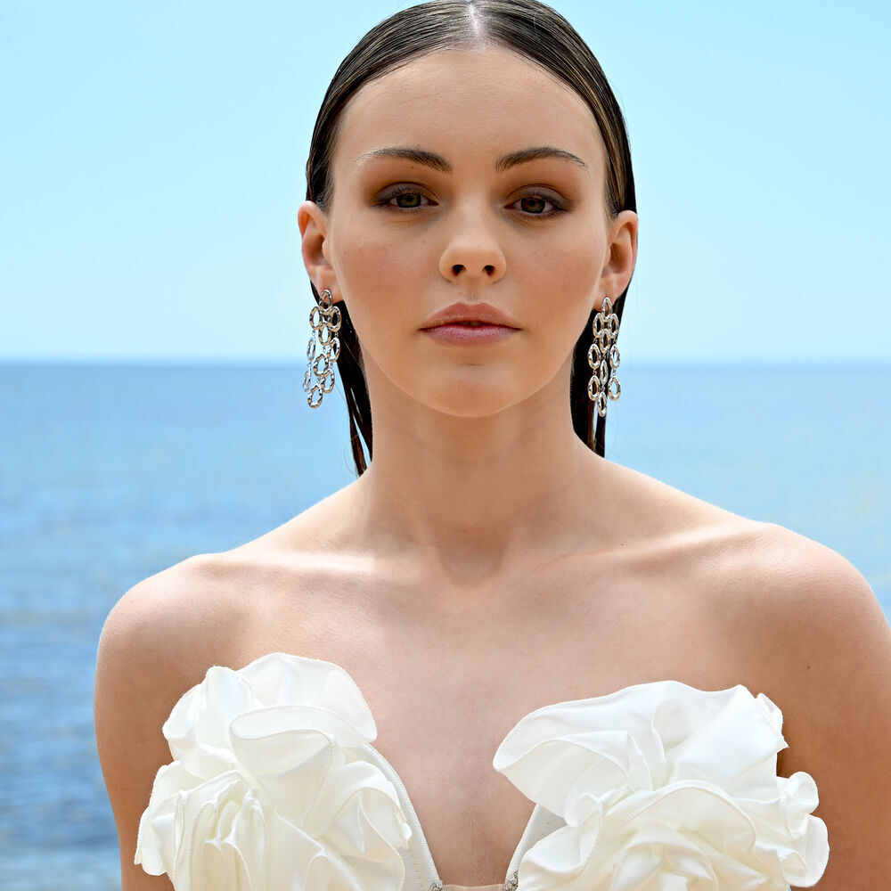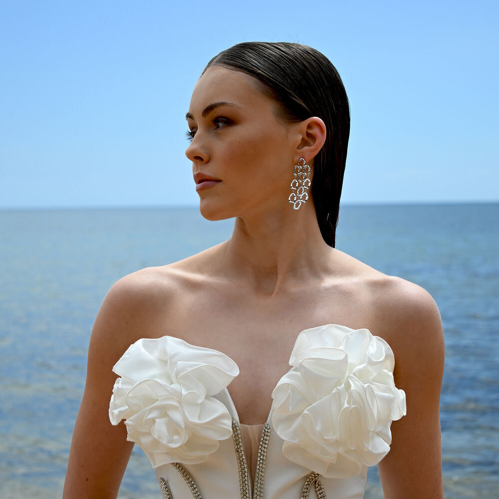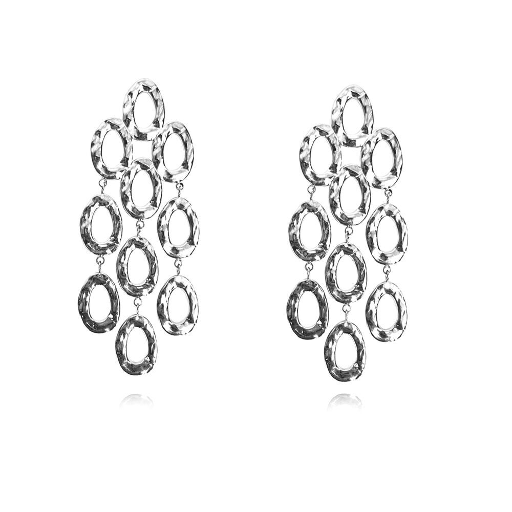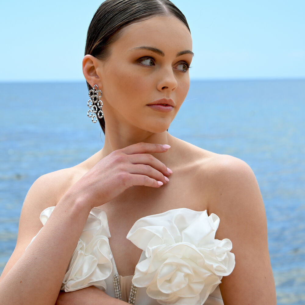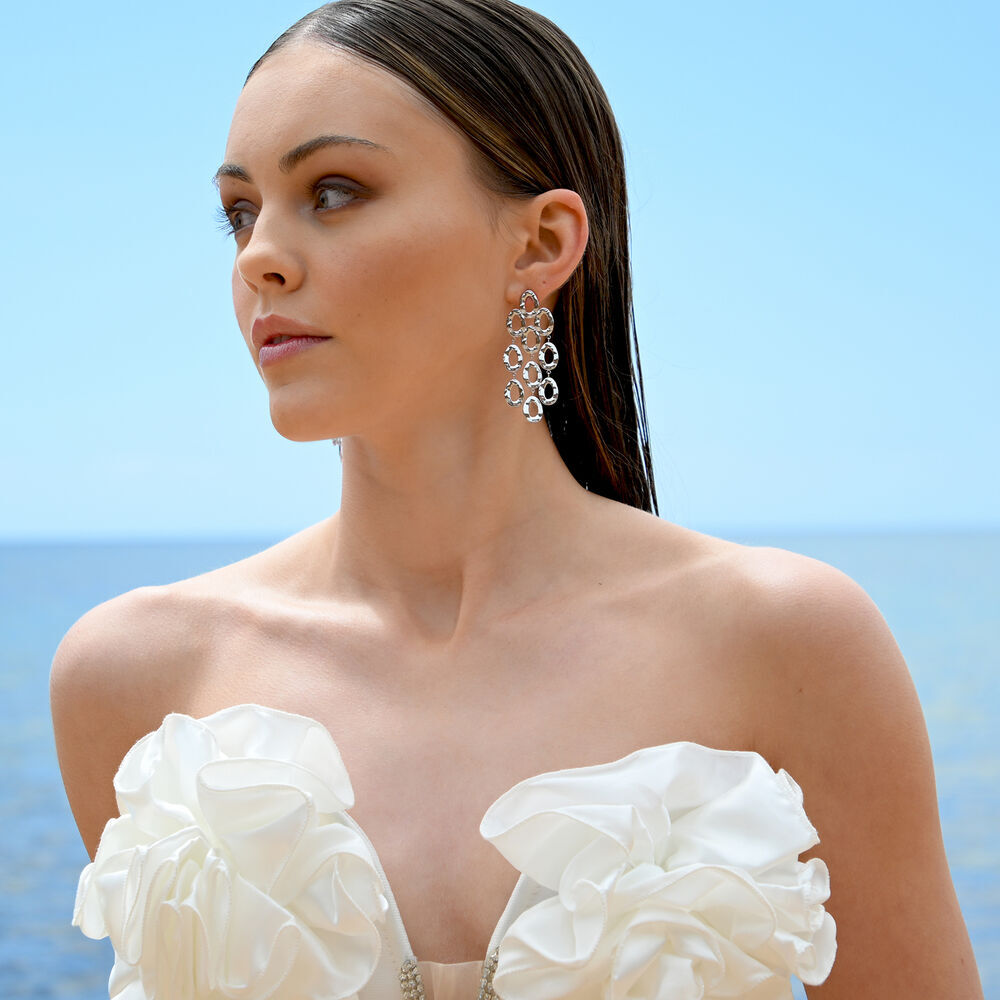 Striking in scale and rich in texture, the Lenore Sculptured Loop Mesh Earrings are designed to command attention. Composed of cascading oval loops, this sculptural design creates fluid movement and a bold silhouette that elongates the neckline with effortless drama.