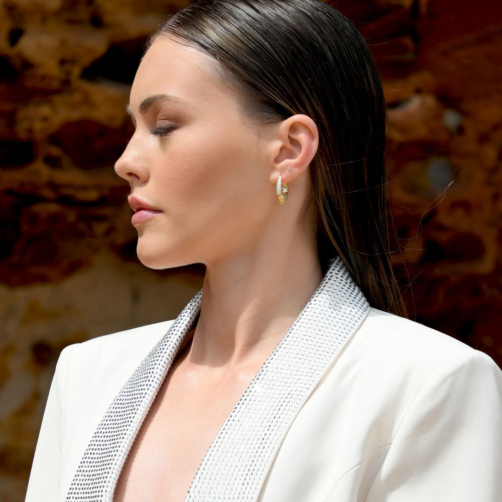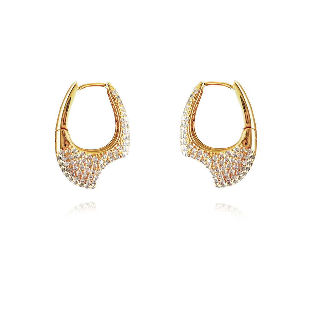 Crafted from ethical sterling silver (S925) and finished with 18ct gold plating, each earring is pavé-set with fine diamantes that catch the light with understated brilliance. The sculpted shard-edge effect creates subtle variation along the surface, giving the piece a hand-worked, almost architectural quality rather than a perfectly uniform finish.