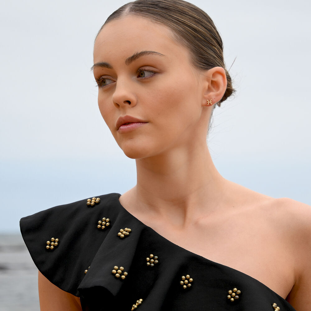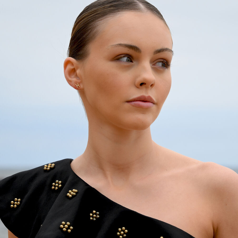 Each earring is meticulously crafted from solid sterling silver and finished with 2 microns of thick 18K gold plating, offering exceptional durability and a rich, luminous finish. The surface is set with Australian cubic zirconia pavé, creating a delicate constellation of light that catches and reflects with every movement.