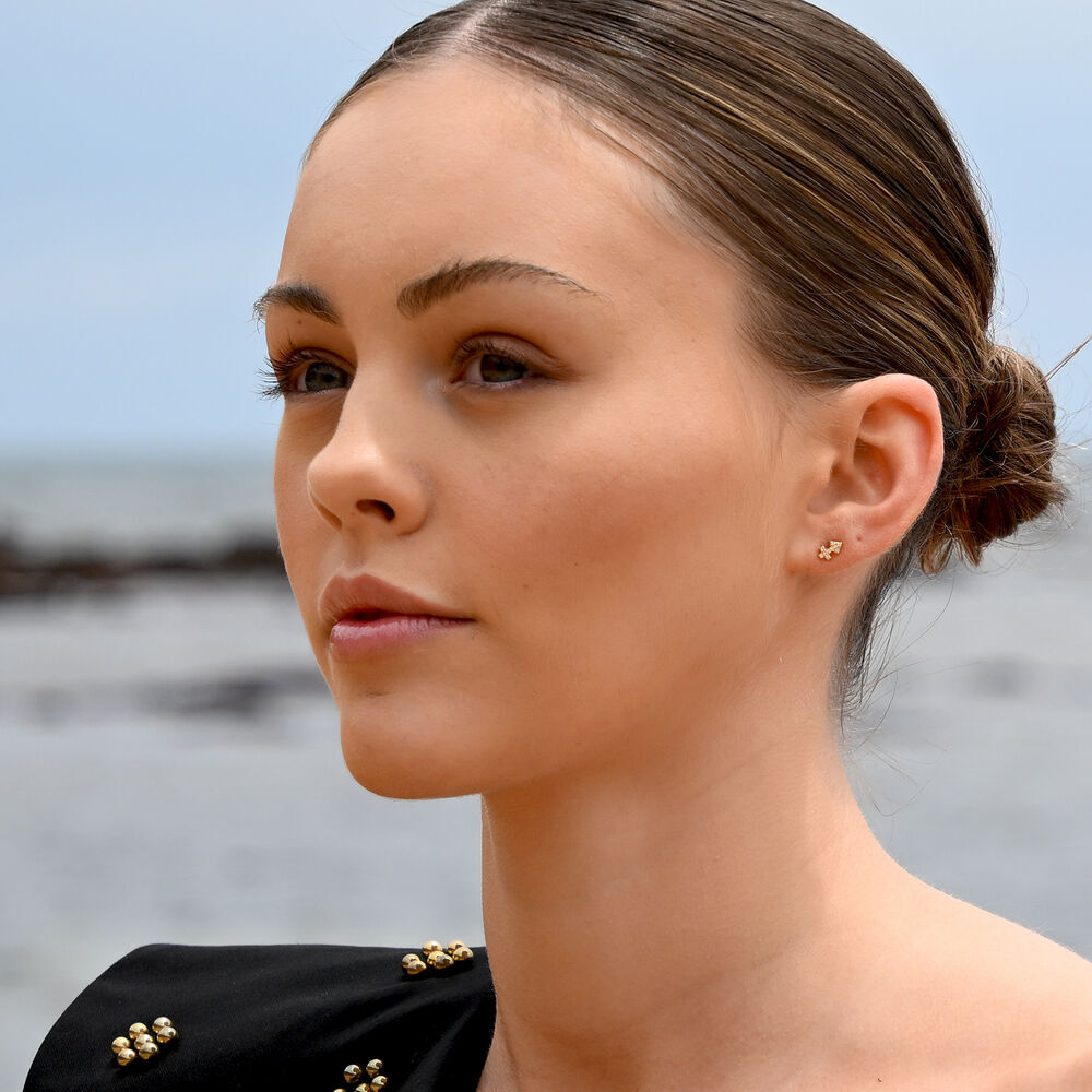Each earring is meticulously crafted from solid sterling silver and finished with 2 microns of thick 18K gold plating, offering exceptional durability and a rich, luminous finish. The surface is set with Australian cubic zirconia pavé, creating a delicate constellation of light that catches and reflects with every movement.