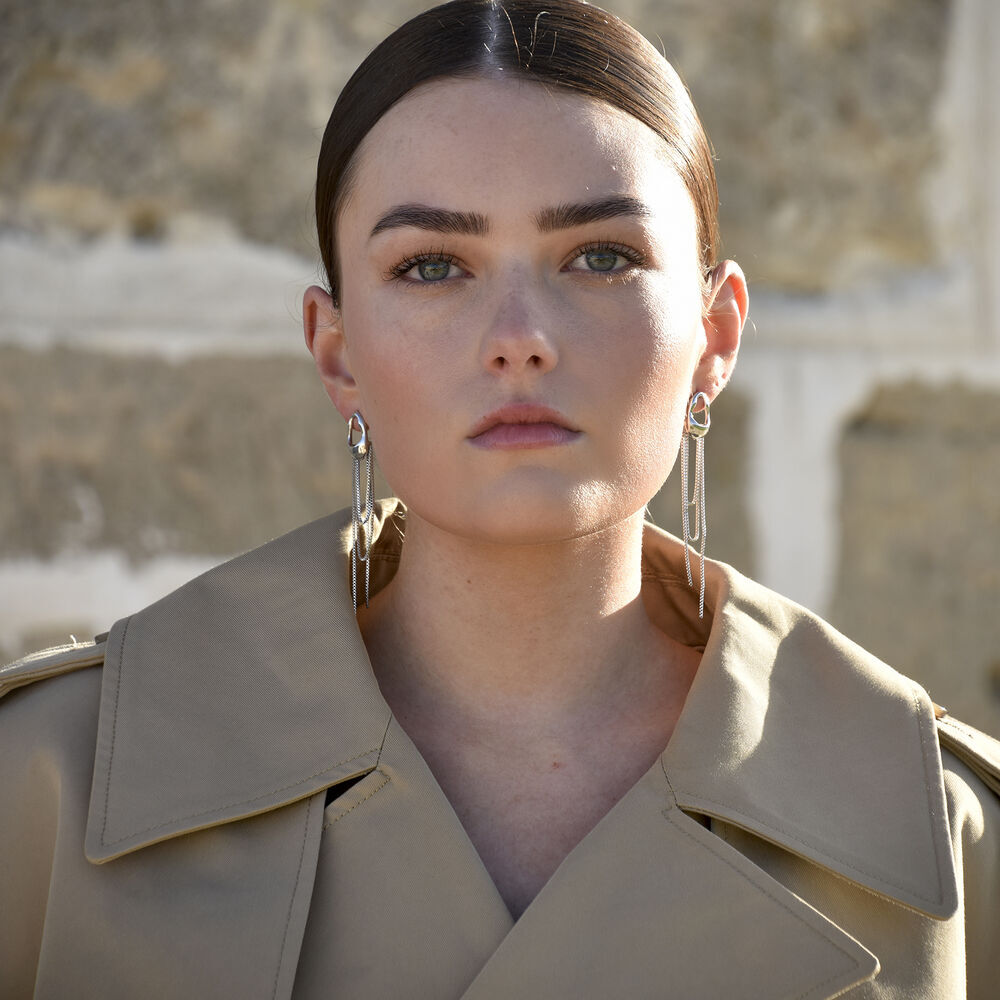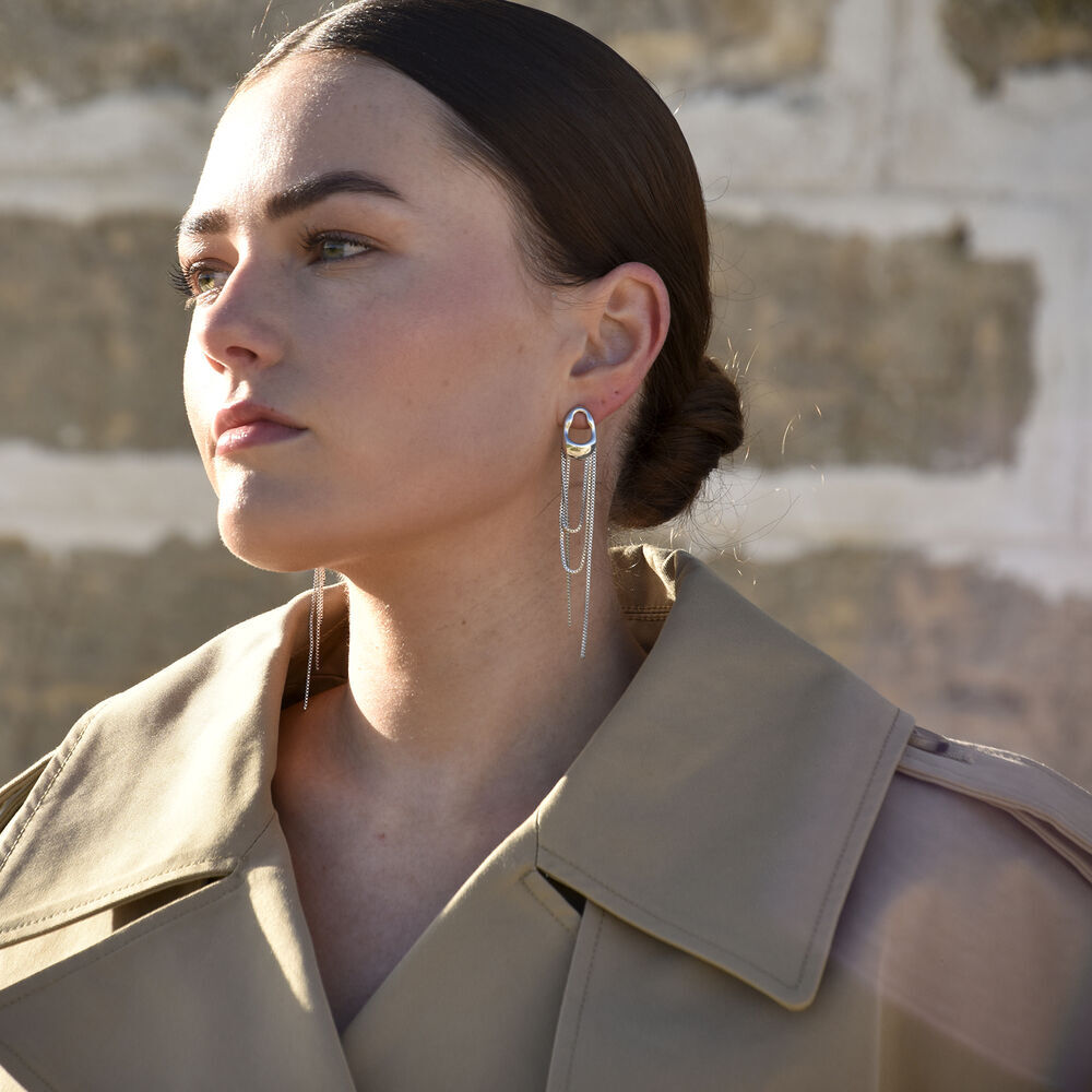 From subtle curves to dazzling drops. Introducing Stellar Drape Diamante Tassel Earrings (Silver) - a light ear statement combining architectural shape with a sparkling glamour. This design features a fluid metal top that flows seamlessly into sparkling diamante tassels. The earrings are made in environmentally friendly brass with silver plating. Lightweight yet bold, they are perfect for making a statement at parties, events, or everyday style upgrades. Available in 18ct gold plating or silver.