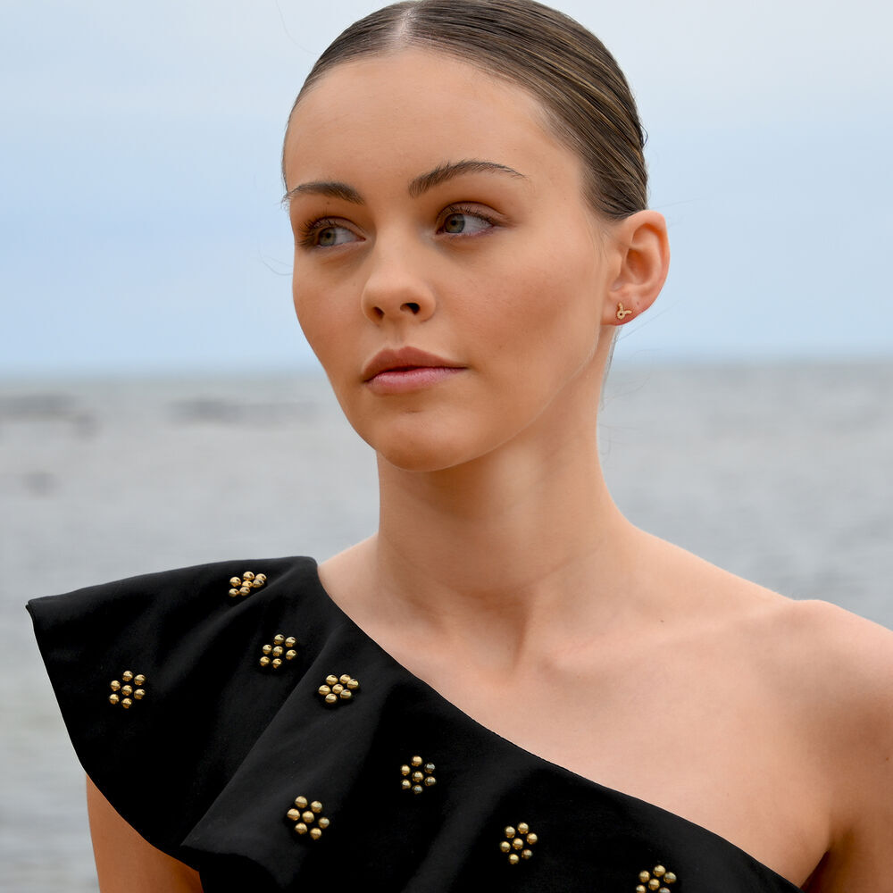 Each earring is meticulously crafted from solid sterling silver and finished with 2 microns of thick 18K gold plating, offering exceptional durability and a rich, luminous finish. The surface is set with Australian cubic zirconia pavé, creating a delicate constellation of light that catches and reflects with every movement.