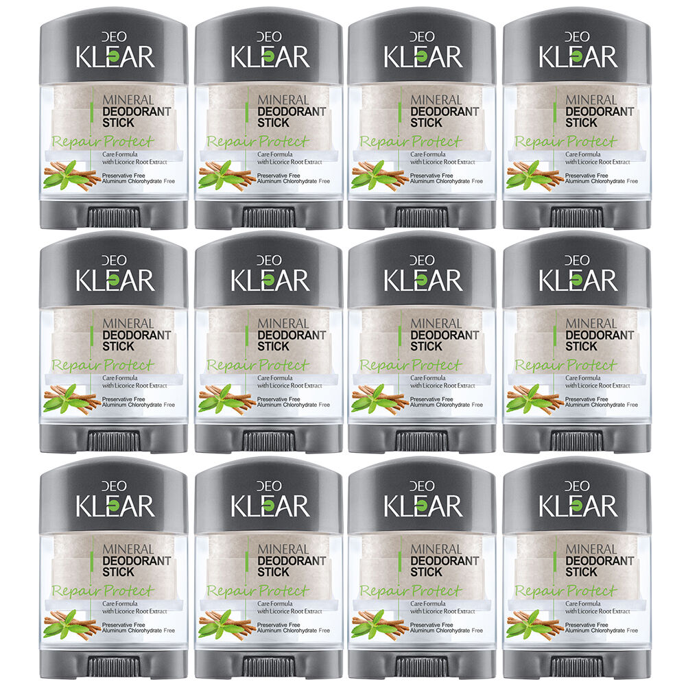 Support fresh confident underarms with Deoklear Mineral Deodorant Repair Protect Licorice 70g. This value bundle contains twelve 70g sticks to provide long lasting gentle care without aluminium chlorohydrate or preservatives.