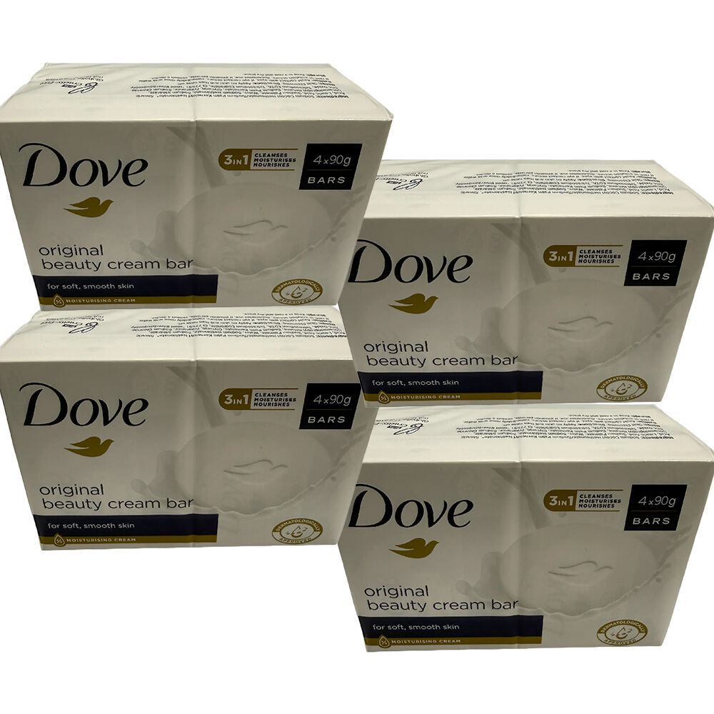 Experience gentle cleansing and lasting hydration with the Dove Beauty Cream Bar Original 4 x 4 Pack 90g bundle. Featuring four packs of four bars each, this value set delivers a total of sixteen moisturising beauty bars enriched with 25% moisturising cream to help nourish and protect your skin leaving it soft smooth and healthy after every wash.