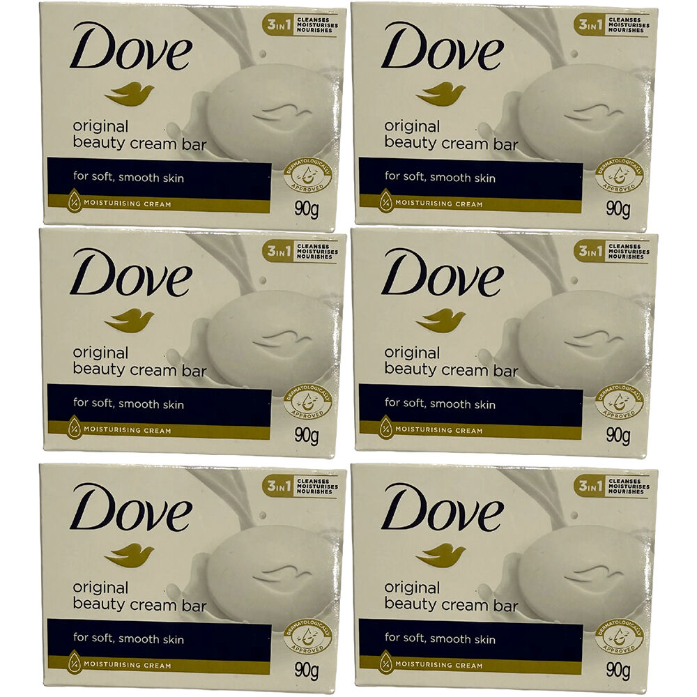 Enjoy soft smooth and healthy looking skin every day with the Dove Beauty Cream Bar Original 90g x 6. Formulated with _ moisturising cream this gentle beauty bar nourishes your skin while cleansing leaving it feeling hydrated and cared for after every wash. Unlike ordinary soap bars that can strip away essential moisture Dove Beauty Bar contains mild cleansers that help maintain your skinÕs natural balance while effectively removing dirt and bacteria. Dermatologically approved and pH balanced this beauty bar is suitable for daily use on both face and body. Its gentle formula is sulphate SLES free and paraben free making it ideal for everyday skincare routines and suitable for a wide range of skin types.