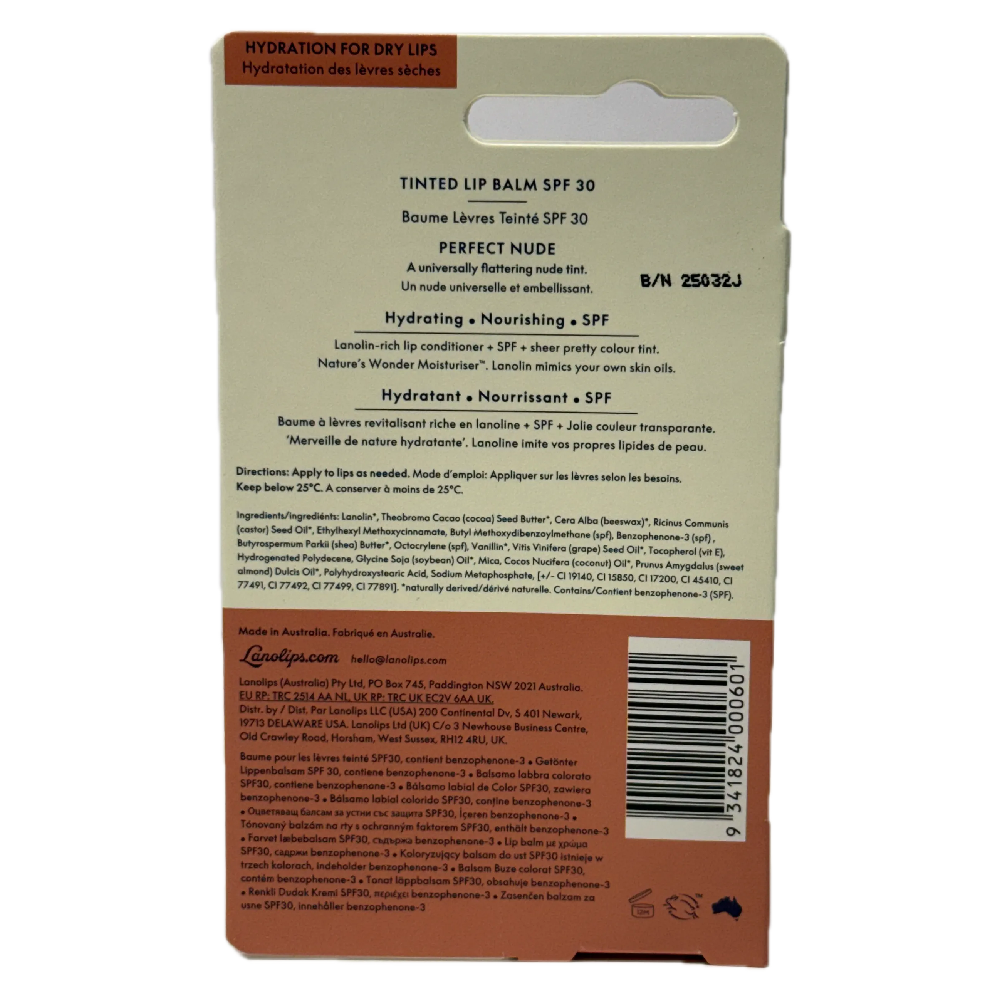 Hydrate protect and enhance your lips with Lanolips Tinted Lip Balm SPF 30 Perfect Nude 12.5g. Powered by ultra pure lanolin this nourishing formula delivers deep long lasting moisture while providing SPF 30 protection and a sheer wearable tint.