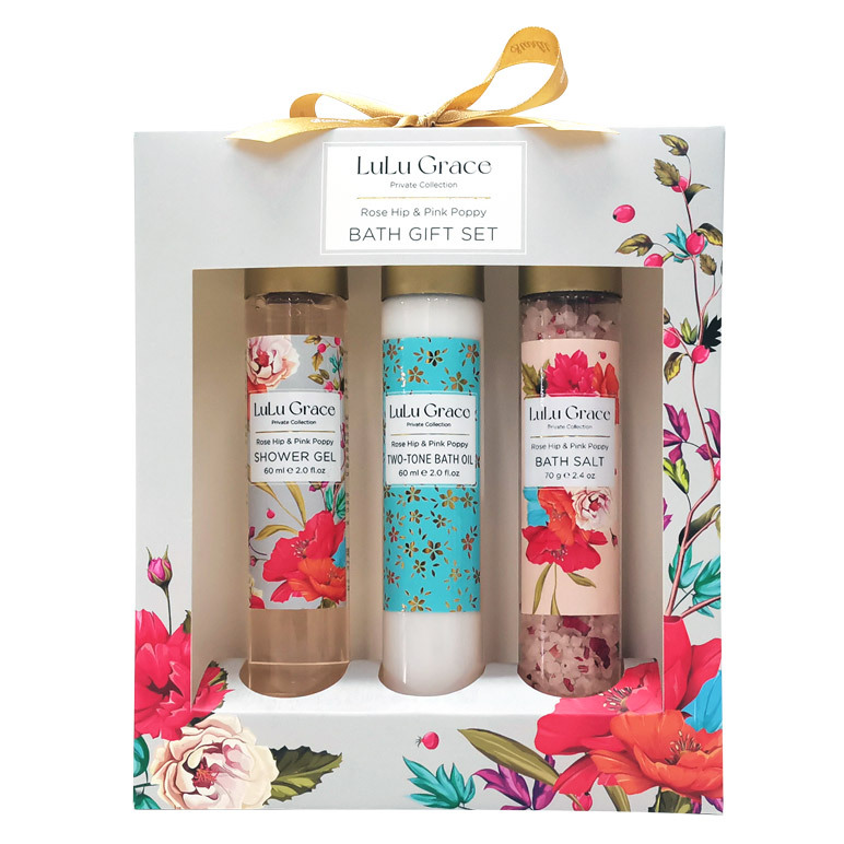 Experience the indulgent Lulu Grace Gift Set, featuring Rose Hip and Pink Poppy. This set includes a fragrant Shower Gel, a luxurious Bath Oil, and soothing Bath Salt. Immerse yourself in a luxurious bathing experience as the Shower Gel cleanses and invigorates your skin. Add a few drops of the Bath Oil for a hydrating and aromatic soak, then indulge in the calming Bath Salt to unwind. Treat yourself or someone special to this exquisite gift set, perfect for a blissful and relaxing self-care ritual with the captivating scents of rose hip and pink poppy.