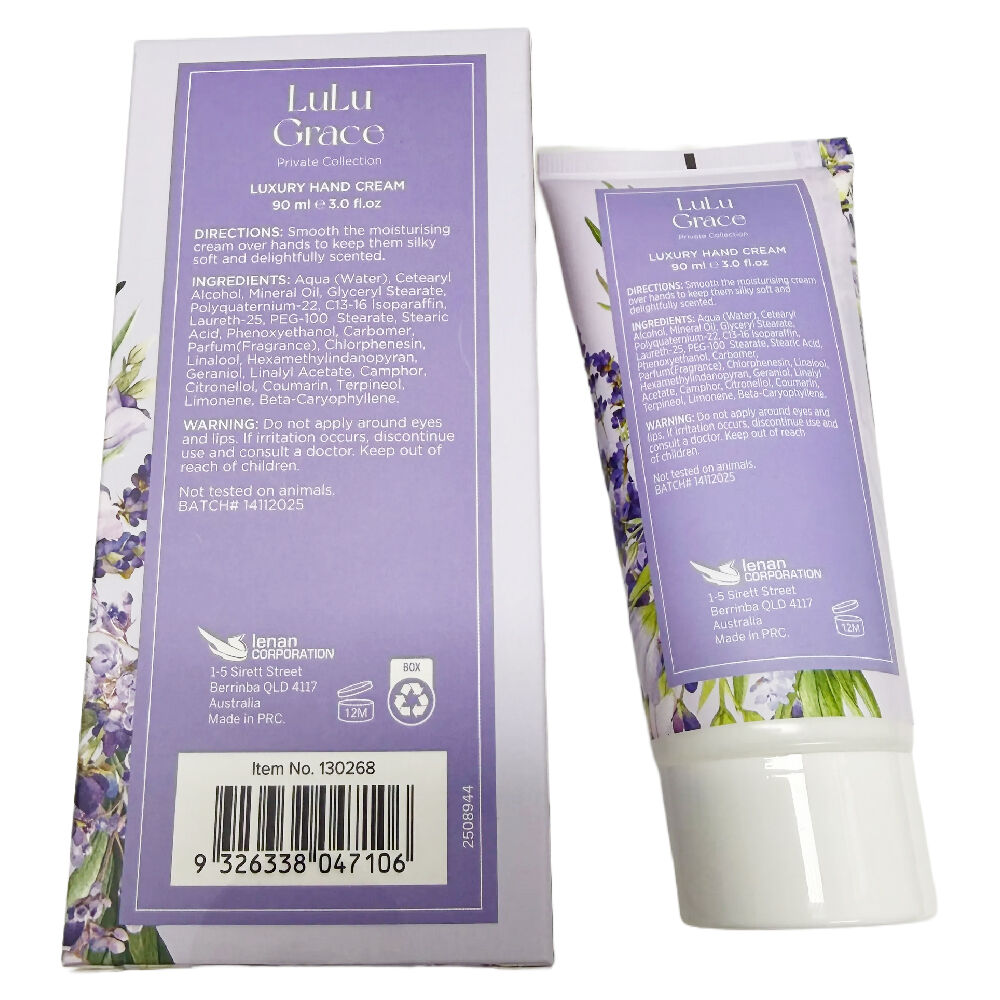 Revitalise and protect hands with Lulu Grace Lavender Hand Cream 6 x 90ml Moisturising Value Bundle. Each tube delivers a calming lavender fragrance and rich hydration to keep hands soft smooth and delicately scented.