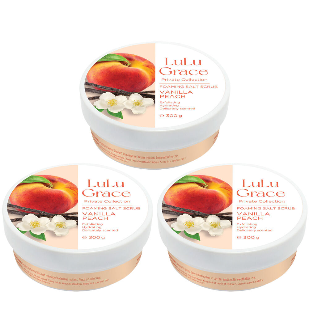 Indulge in smooth refreshed skin with Lulu Grace Vanilla Peach Foaming Salt Body Scrub 300g Pack of 3. This creamy foaming salt scrub combines effective salt exfoliation with a sweet vanilla and ripe peach fragrance for a revitalising shower experience.