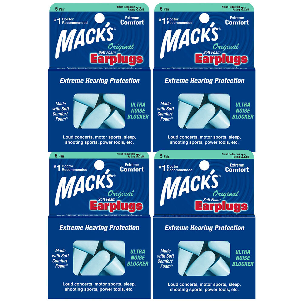 Experience reliable hearing protection with Macks Original Soft Foam Earplugs. This value bundle contains four sealed packs of five pairs each for a total of 20 pairs. Rated NRR 32 dB to reduce noise for sleeping, travel, work, shooting and loud events.