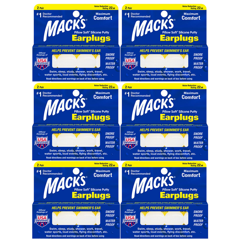Experience reliable hearing protection with Macks Pillow Soft Silicone Putty Earplugs 2 Pair Bundle Pack of 6. This value pack contains six individual packs each with two pairs for a total of 12 pairs. Each earplug molds to the unique contours of the outer ear to create a comfortable waterproof seal and offers a Noise Reduction Rating NRR 22 dB for sleeping swimming travel studying and noisy events.