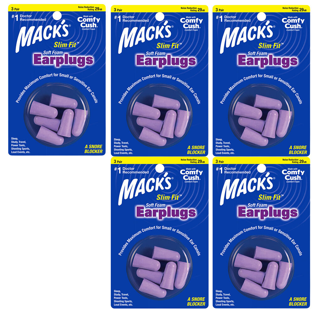 5 x 3 pair packs (15 pairs total) of Macks Slim Fit Soft Foam Earplugs. NRR 29 dB.