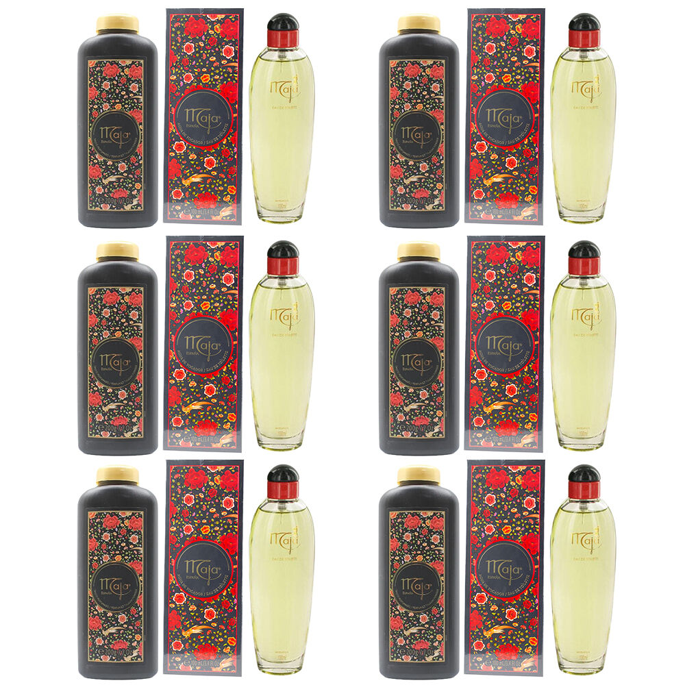 Indulge in timeless elegance with the Maja perfumed gift set pack of 6 featuring a 100ml Eau De Toilette and a 200g perfumed talcum powder. This Spanish classic pairs a warm floral spicy fragrance with silky body care for all day freshness.