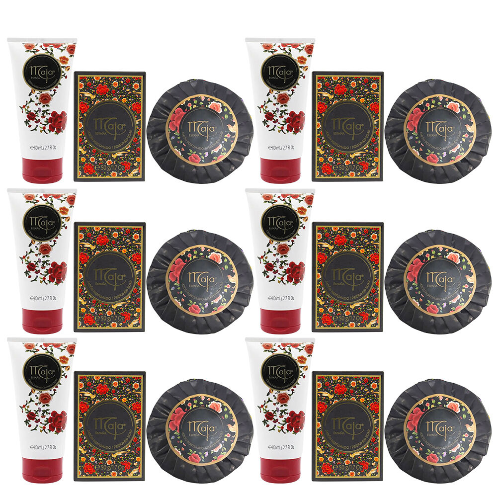 Enjoy timeless elegance with the Maja Three Piece Skincare Set pack of 6 featuring the classic floral fragrance loved for generations. This indulgent collection includes a 50g hand soap bar, an 80ml hand cream and a 100g round bath soap each crafted to leave skin delicately scented, soft and nourished.