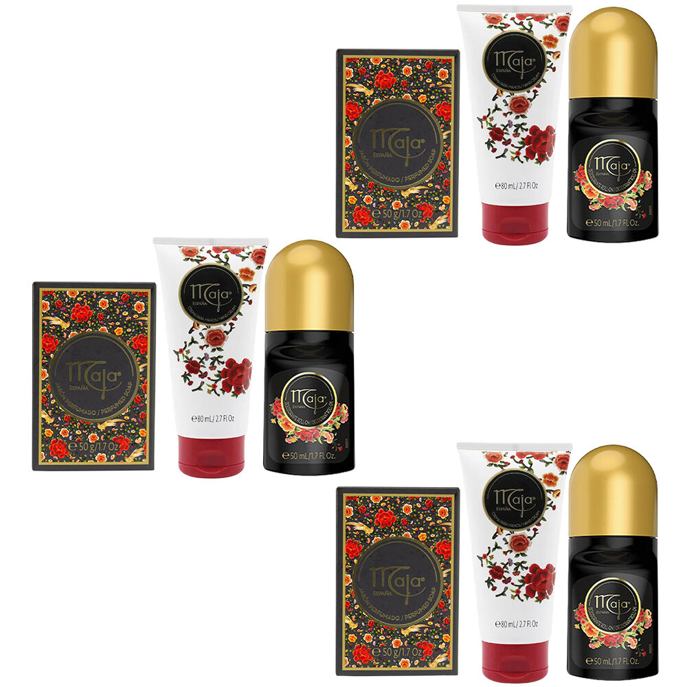 The 50g hand soap gently cleanses while leaving hands delicately scented with the Maja signature floral blend. The 80ml hand cream nourishes and restores moisture with almond oil and vitamin E for soft smooth skin. The 50ml roll on deodorant delivers reliable underarm protection and a lasting sweet floral aroma.