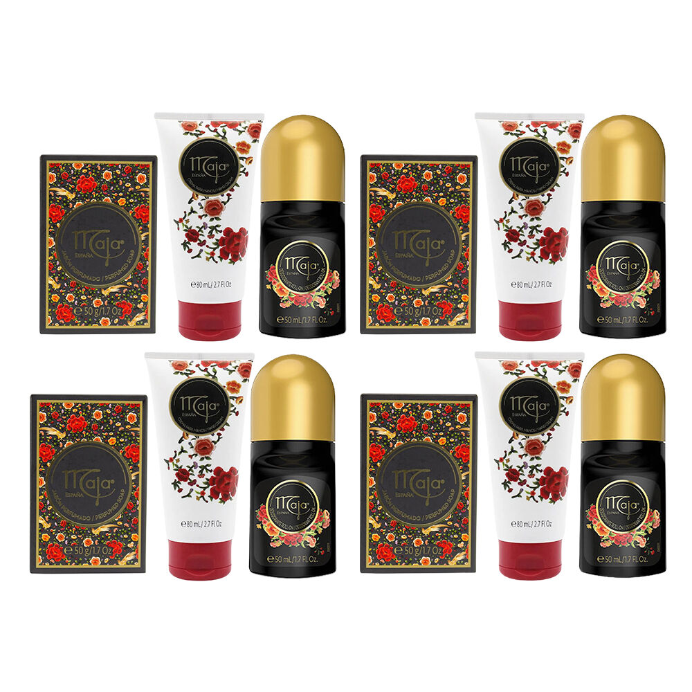 Refresh and care for your skin with the Maja Floral Hand Care Trio Pack of 4. This value bundle contains four sets each featuring a 50g hand soap bar, an 80ml fast absorbing hand cream, and a 50ml deodorant roll on infused with romantic floral notes and essential oils for daily use.