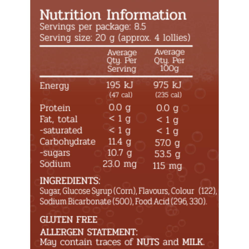 Sugar, Glucose Syrup (Corn), Flavours, Colour (122), Sodium Bicarbonate (500), Food Acid (296, 330)